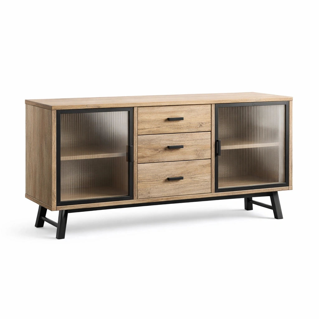 Aparador de madera con puertas de vidrio templado y cajones