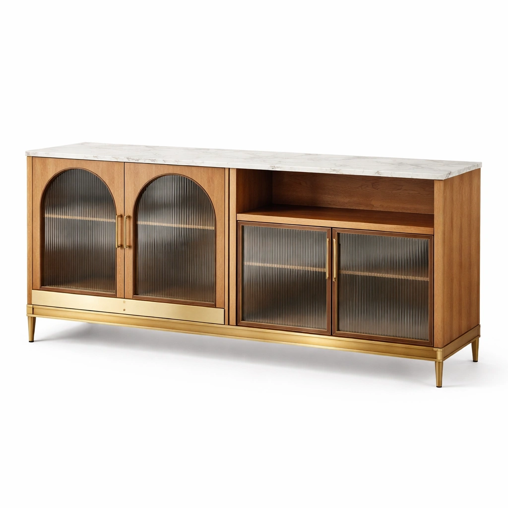 Este aparador tiene una estructura de madera maciza, con una encimera de mármol blanco. Las puertas están hechas de vidrio acanalado, y la base es de acero recubierto de dorado. Sus dimensiones son 180 cm de ancho, 80 cm de alto y 50 cm de profundidad. El color principal es madera natural con detalles dorados. Pesa 60 kg.