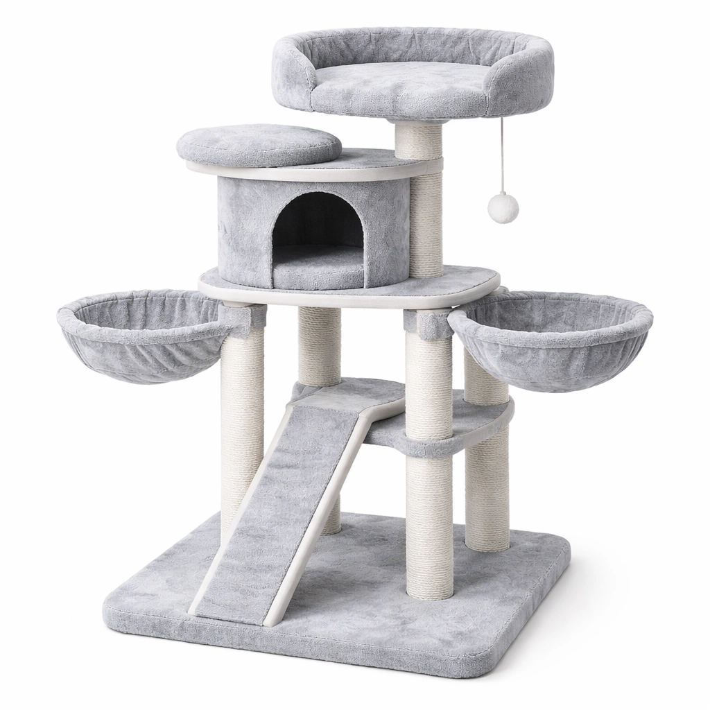 Incluye plataformas, cueva y cestas para descanso y juego de gatos.